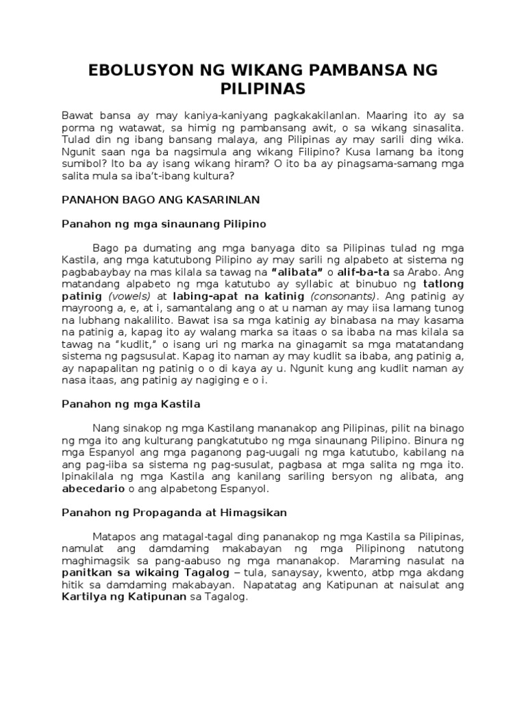 Kasaysayan ng Pagkakabuo ng Pambansang Wika Sa loob ng mahabang panahon ng pananakop ng Espanya Espanyol ang opisyal na wika at ito rin ang wikang panturo. Kaya naman gingagamit ang Filipino bilang wika sa pang-araw-araw na. Bukas ang unang draft sa pagbabago upang lalo mapabuti ang akademikong sulatin.