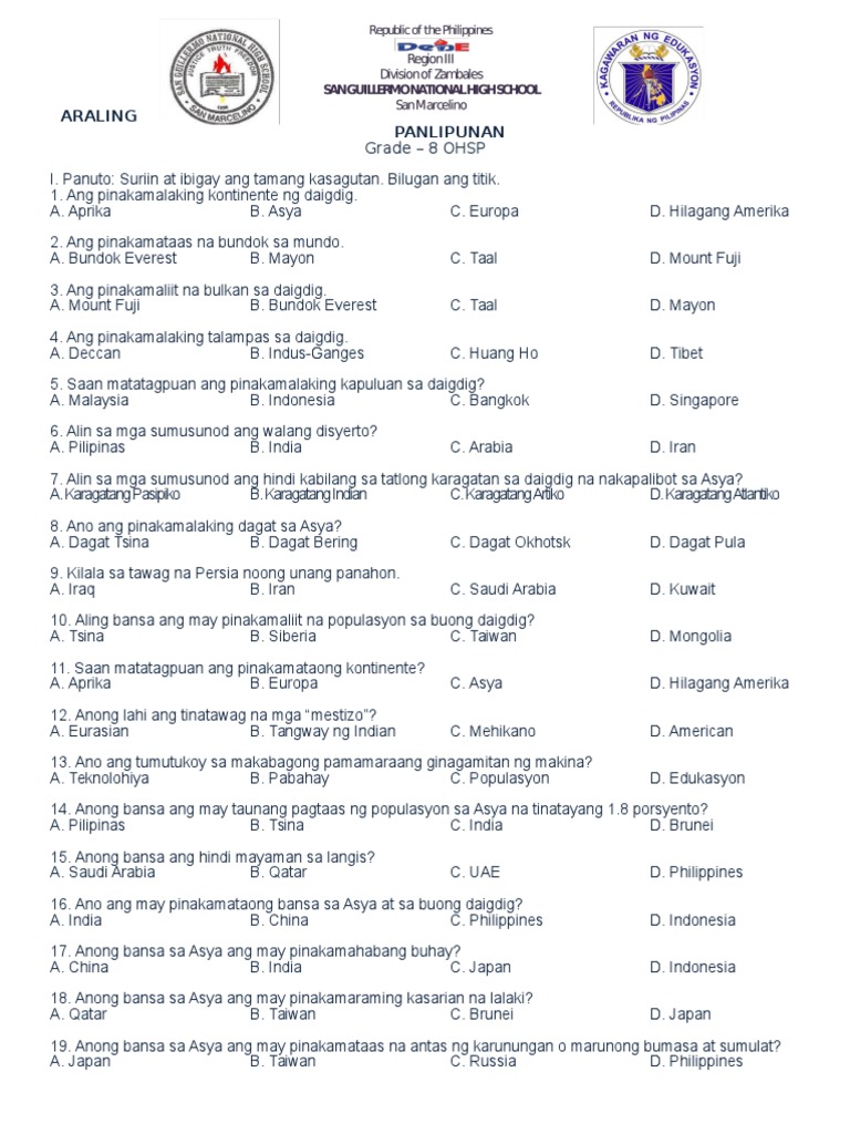 Grade 1 Unang Markahang Pagsusulit Sa Araling Panlipunan I Pdf Source. K to 12 - Grade 8 Araling Palipunan Learner Module Nico Granada. Post Comments Atom Followers.